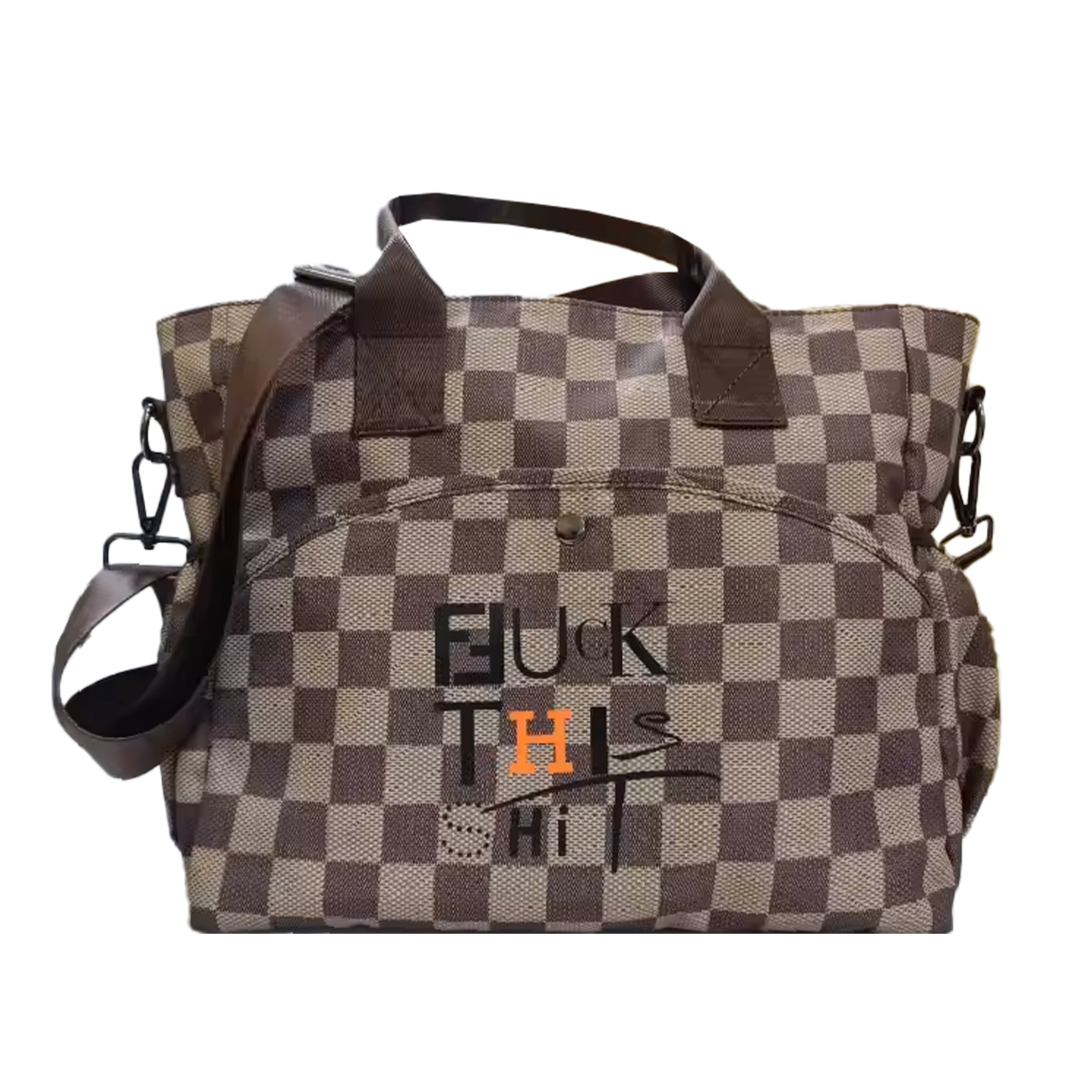 Features zipper top closure, outer zipper pocket, and cheeky design. Bag has both a removable shoulder strap and standard handles. Canvas exterior with high quality lining. Interior pocketing with branded PU leather detailing.