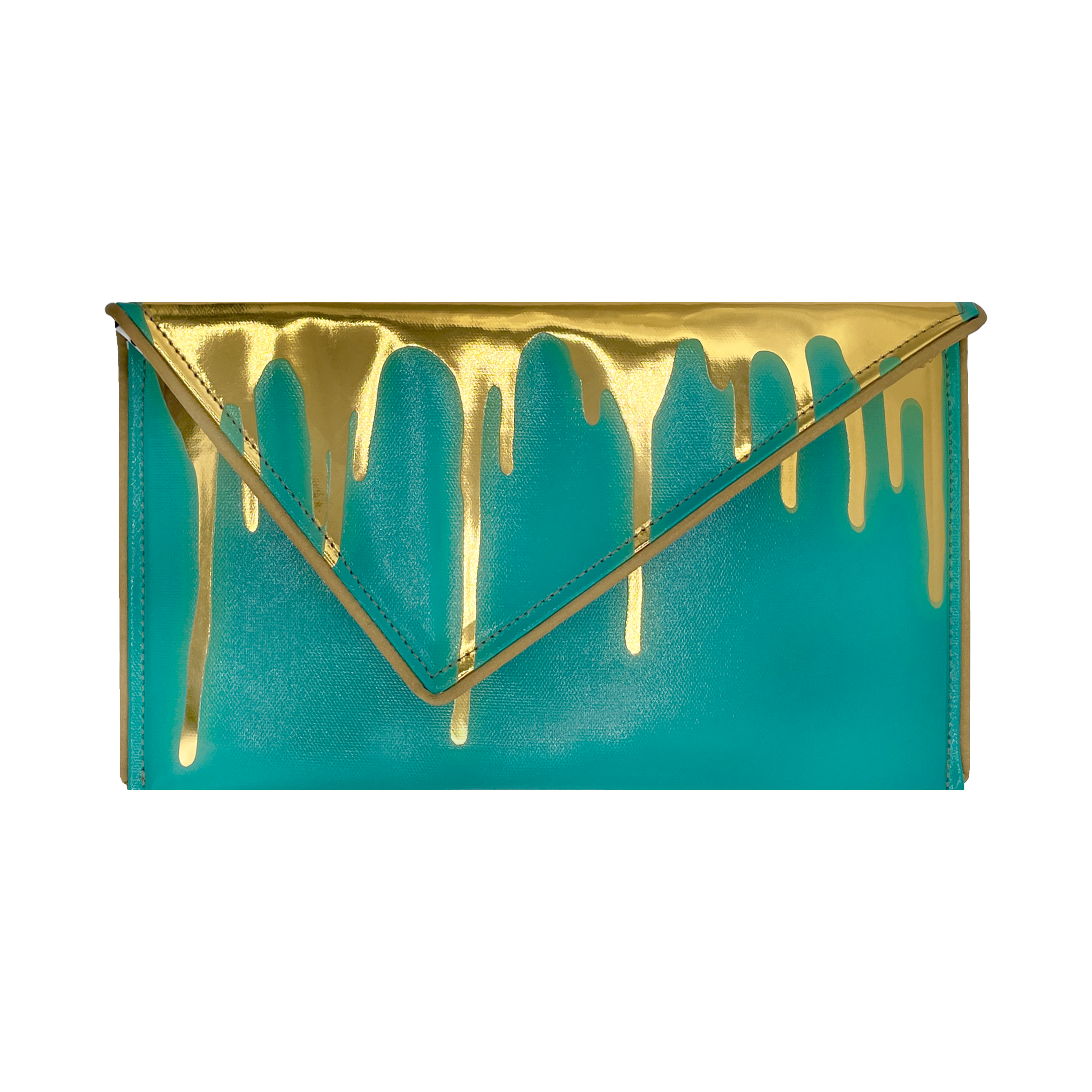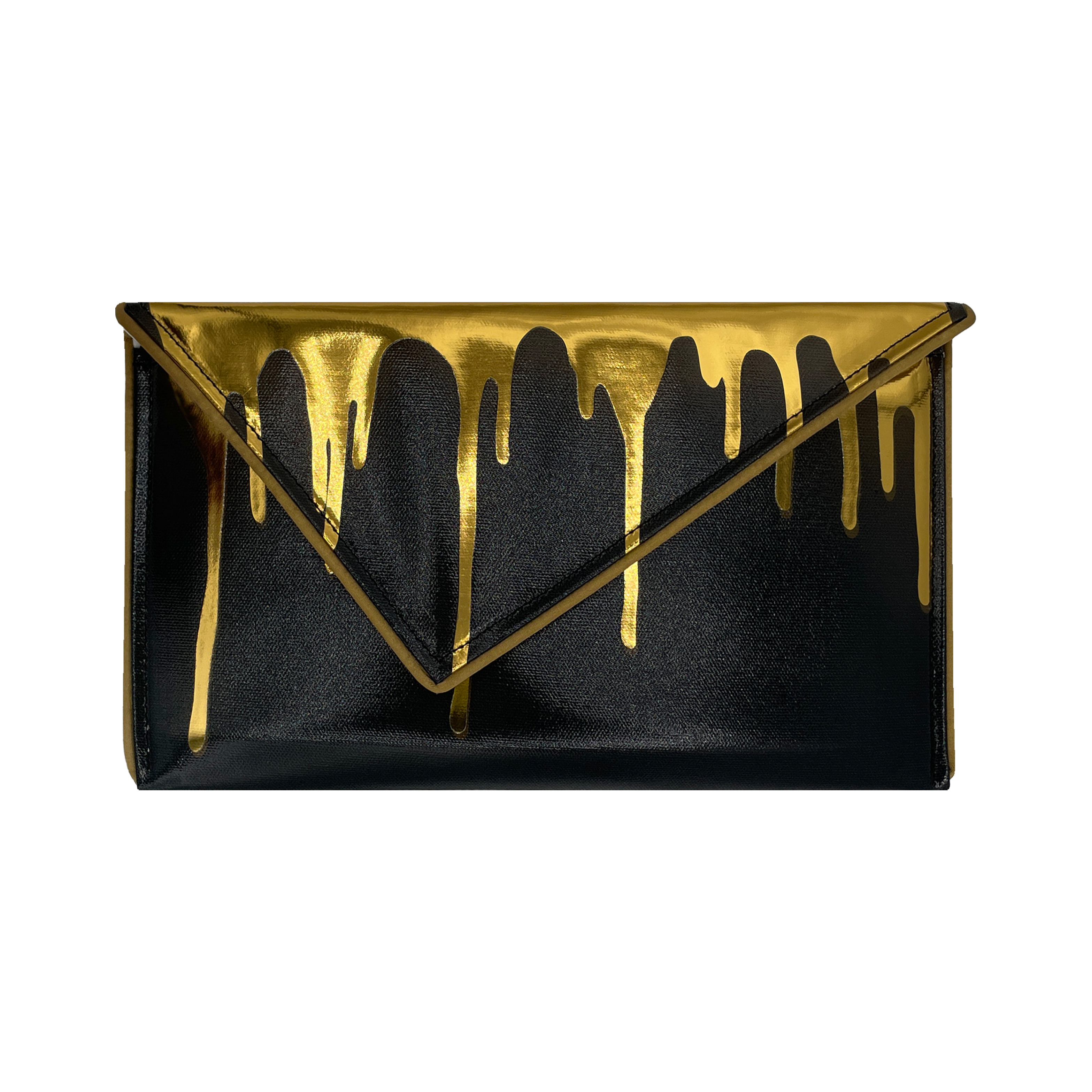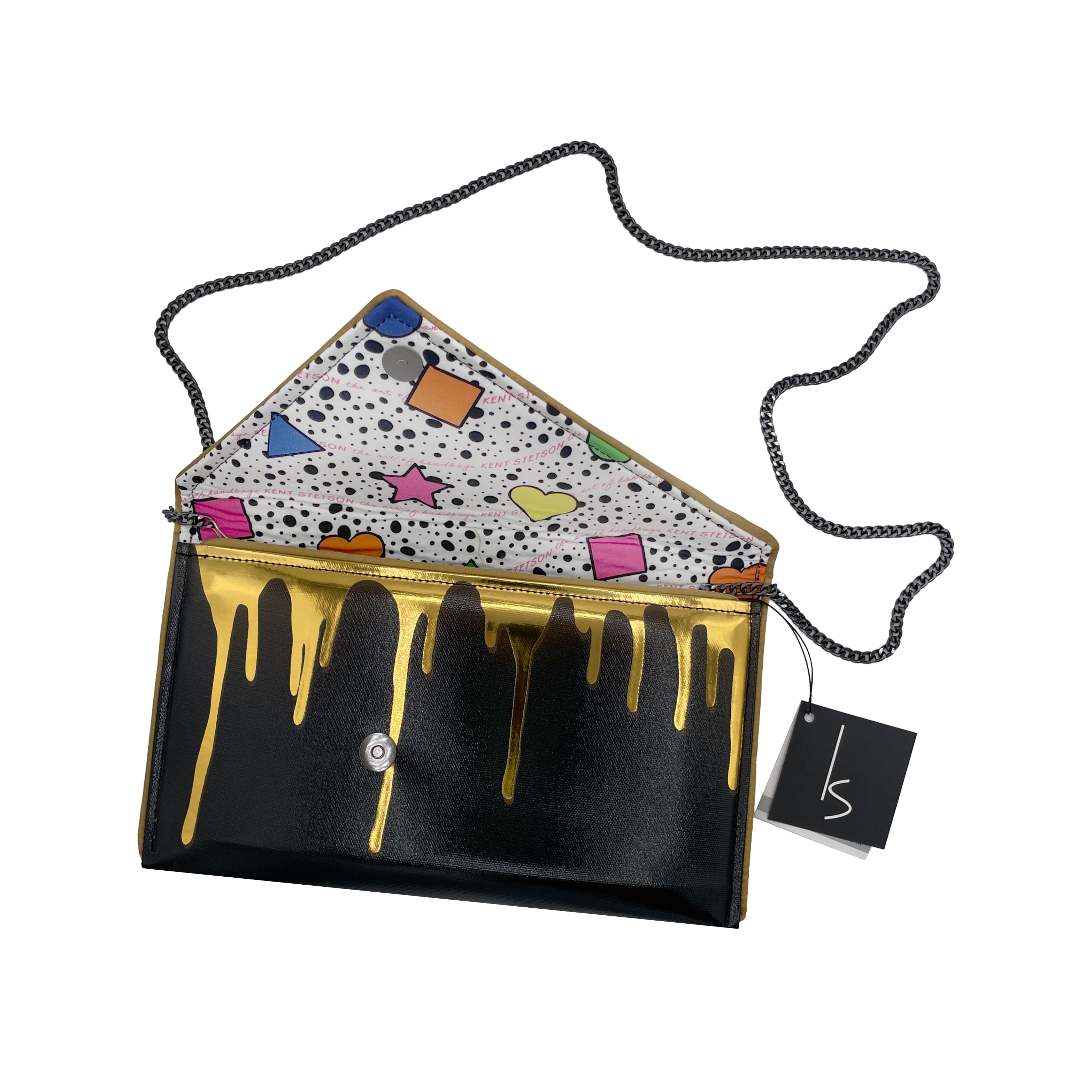 Gorgeous asymmetrical clutch featuring a dripping in gold metallic foil design. Cruelty-free, made from luxury quality coated canvas. All bags come with a removable cross-body chain, logo dust bag, clear vinyl inner pocket, and are individually signed. Inside fabric may differ from what is pictured. Price includes shipping.