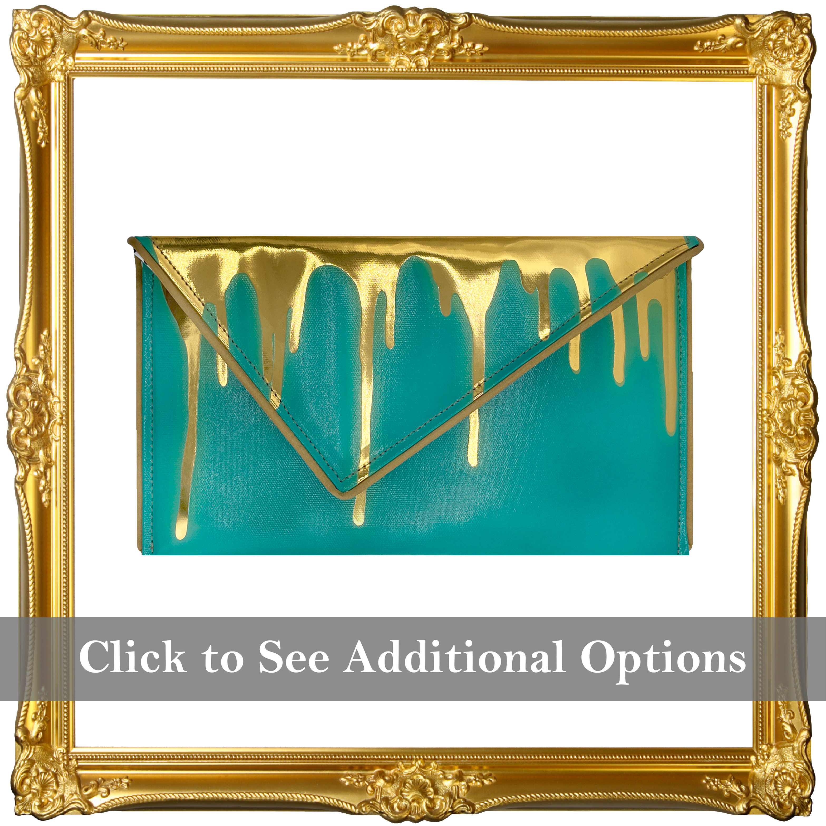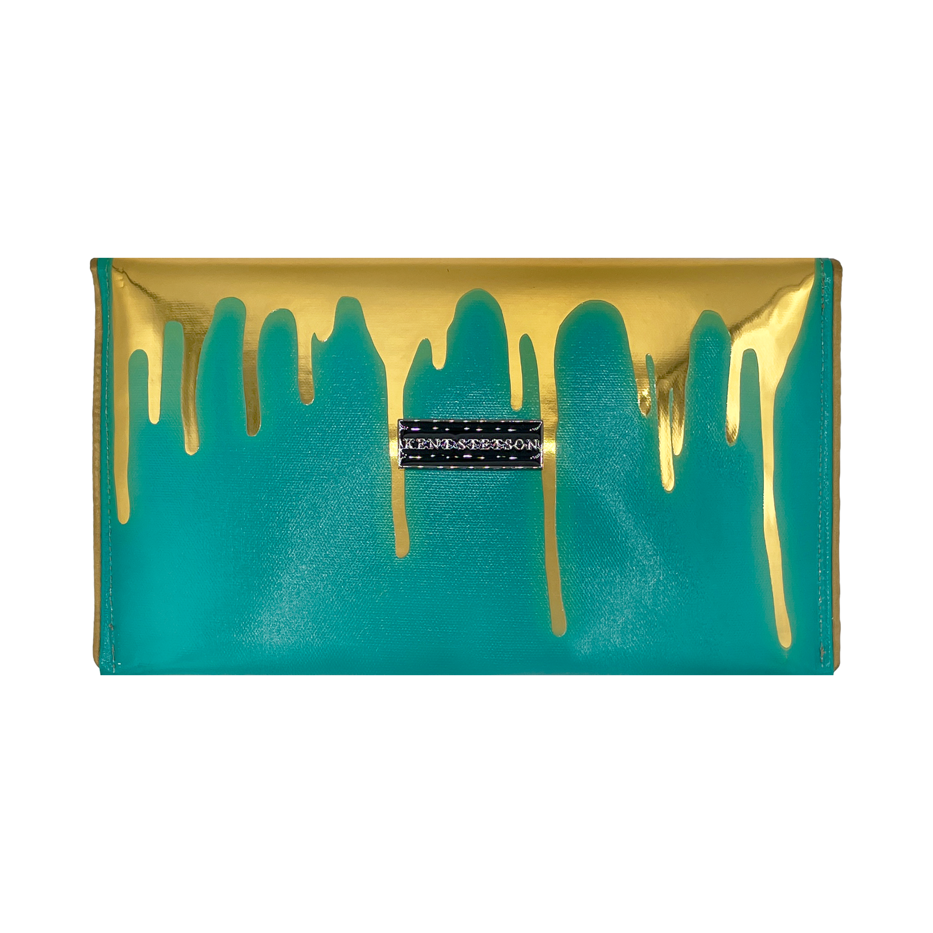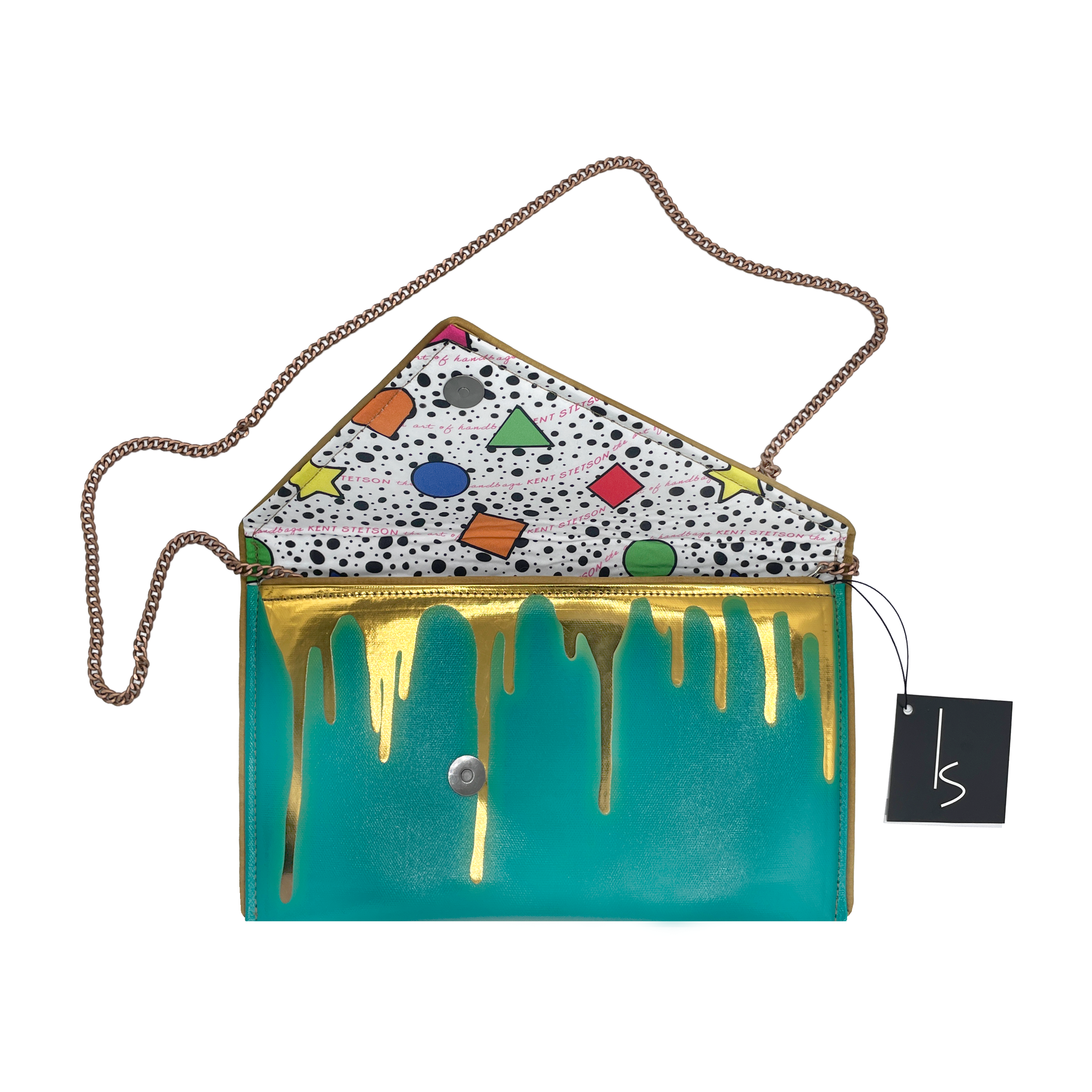 Gorgeous asymmetrical clutch featuring a dripping in gold metallic foil design. Cruelty-free, made from luxury quality coated canvas. All bags come with a removable cross-body chain, logo dust bag, clear vinyl inner pocket, and are individually signed. Inside fabric may differ from what is pictured. Price includes shipping.