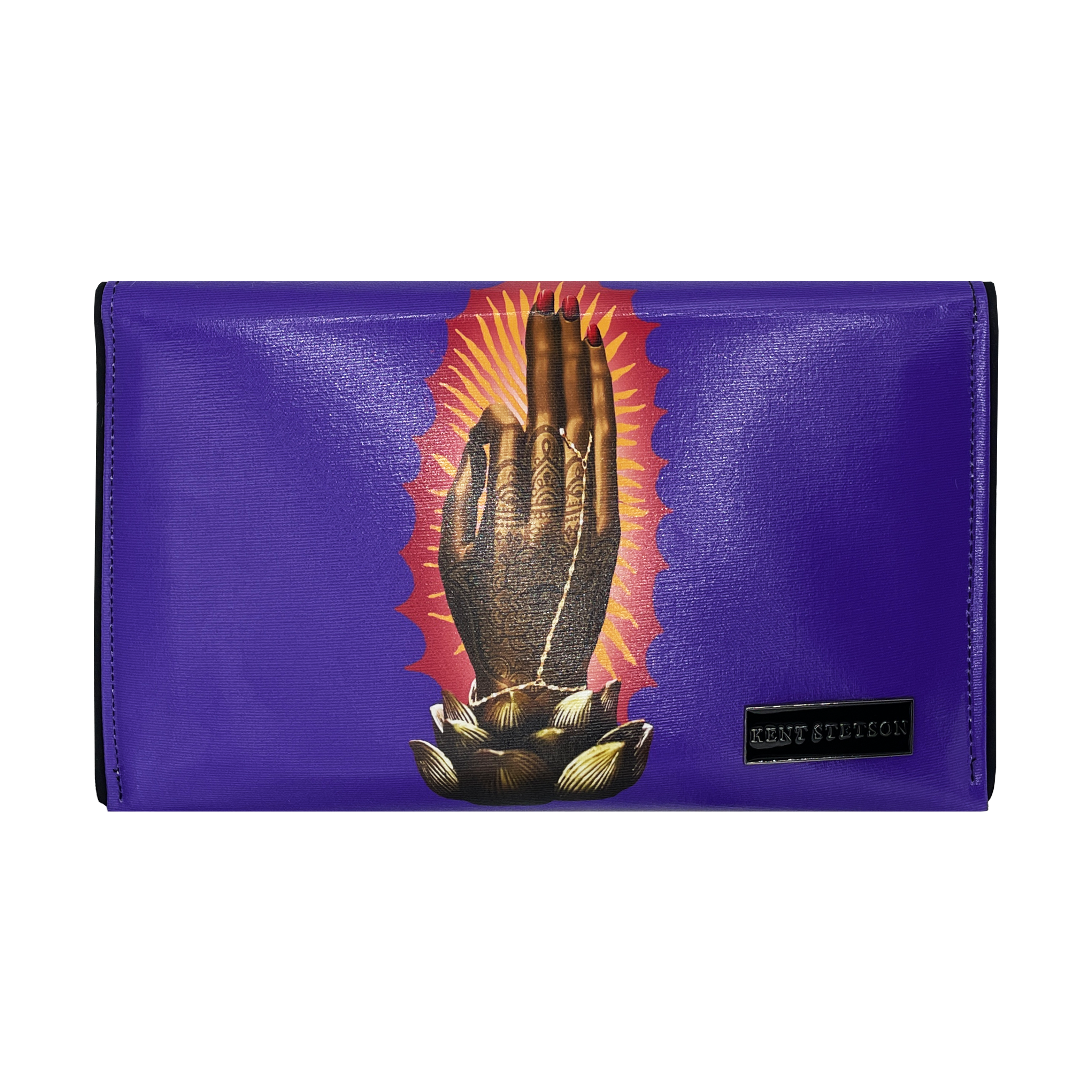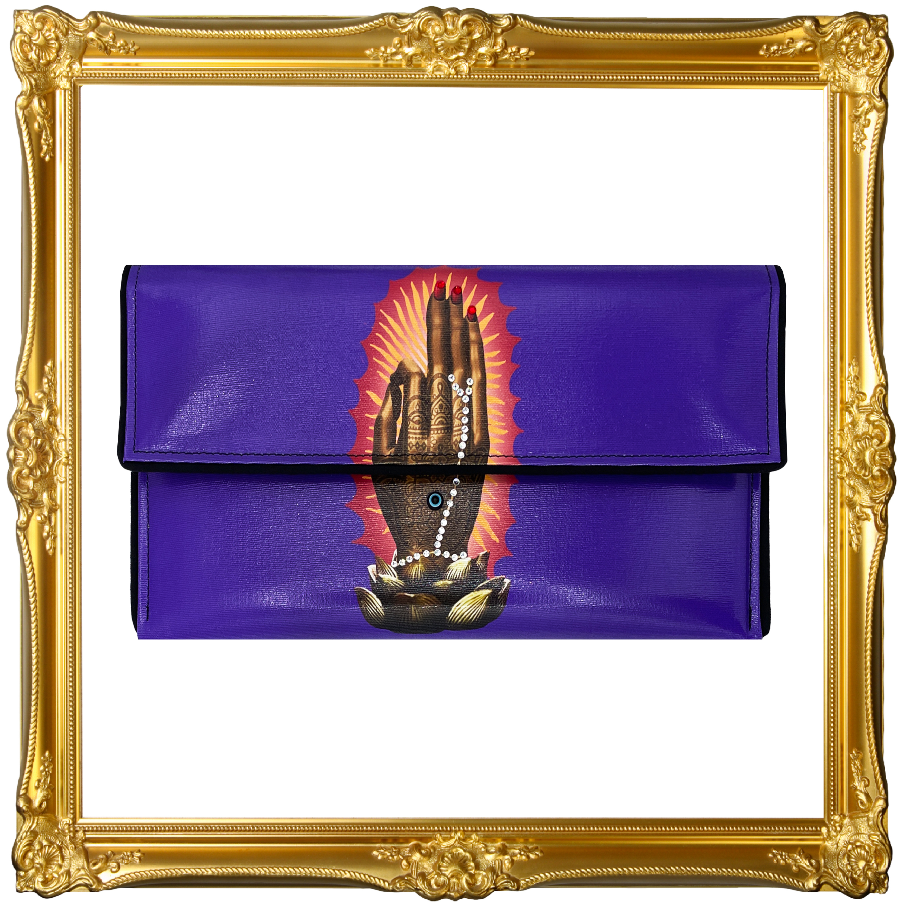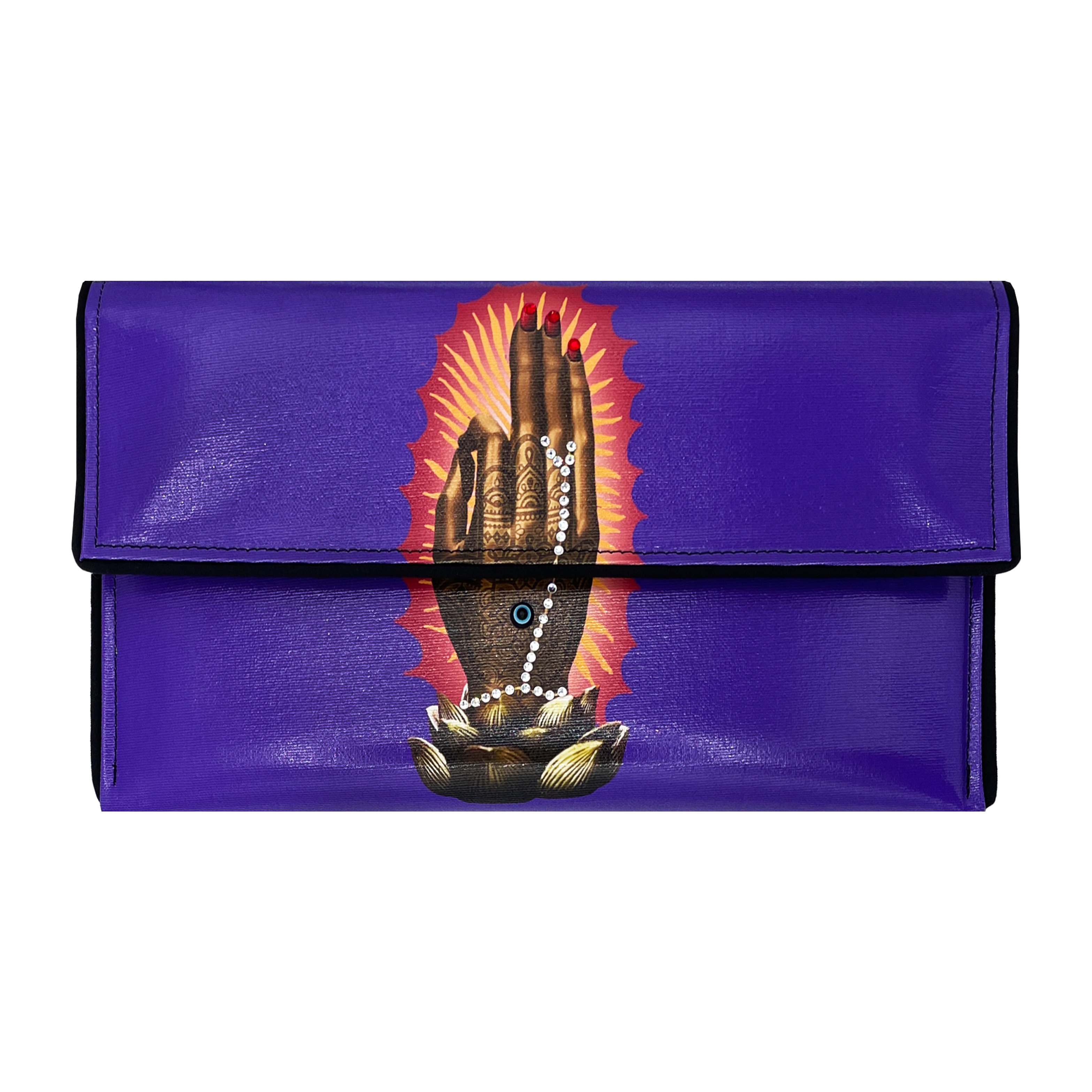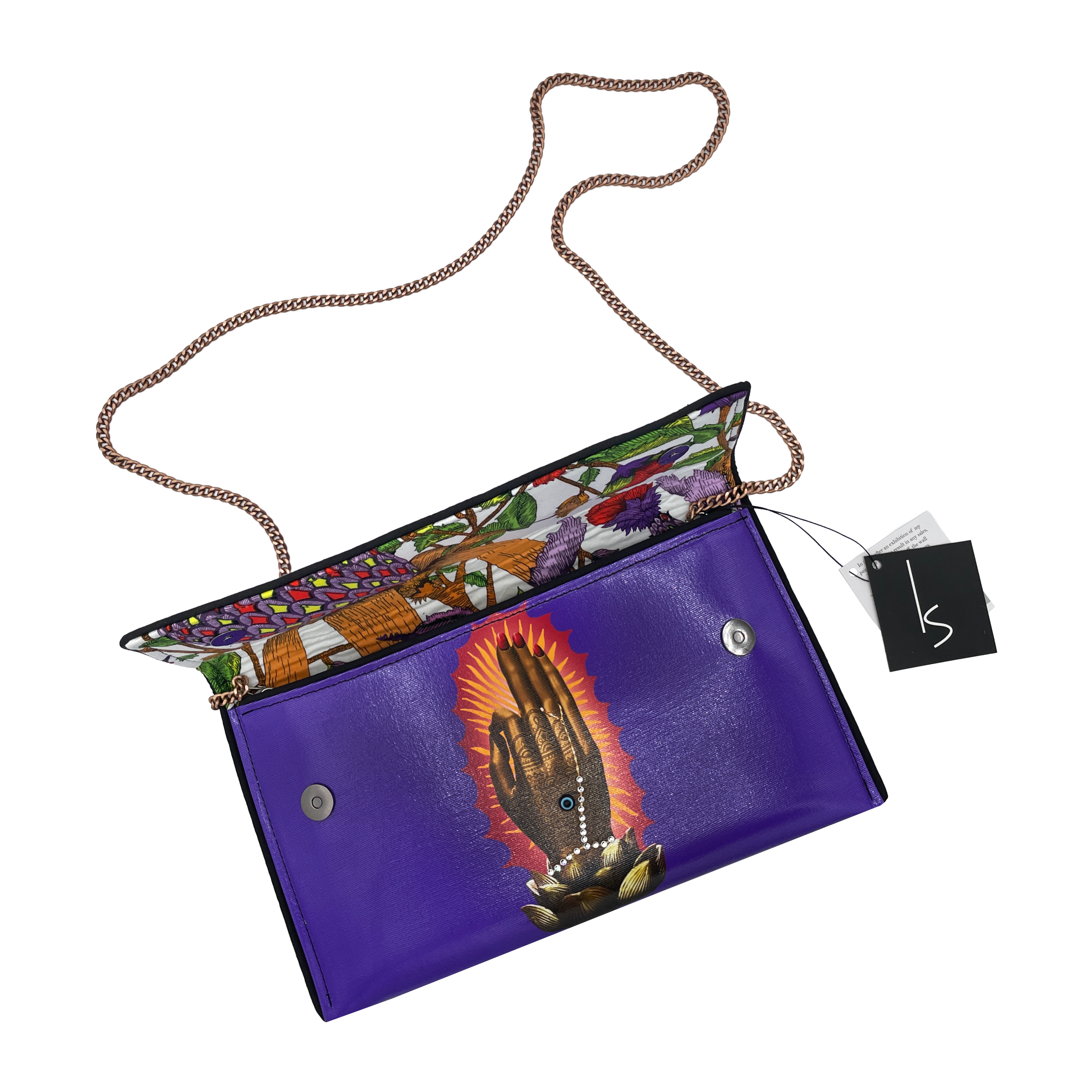 A patchwork of spiritual symbols accented with crystals and an Evil Eye cabochon. Cruelty-free, made from luxury quality coated canvas. Includes a removable cross-body chain, logo dust bag, clear vinyl inner pocket, and are individually signed. Inside fabric may differ from what is pictured.