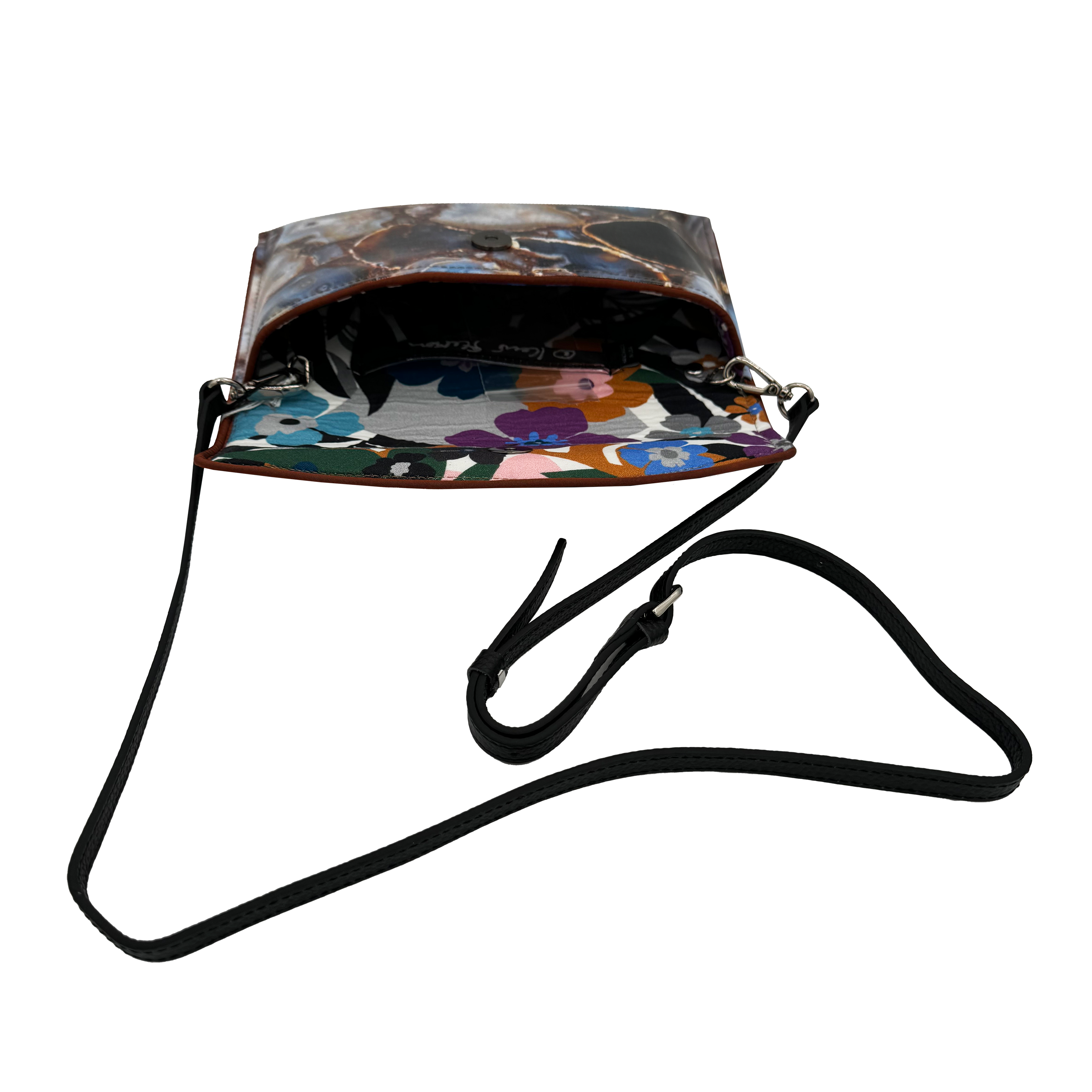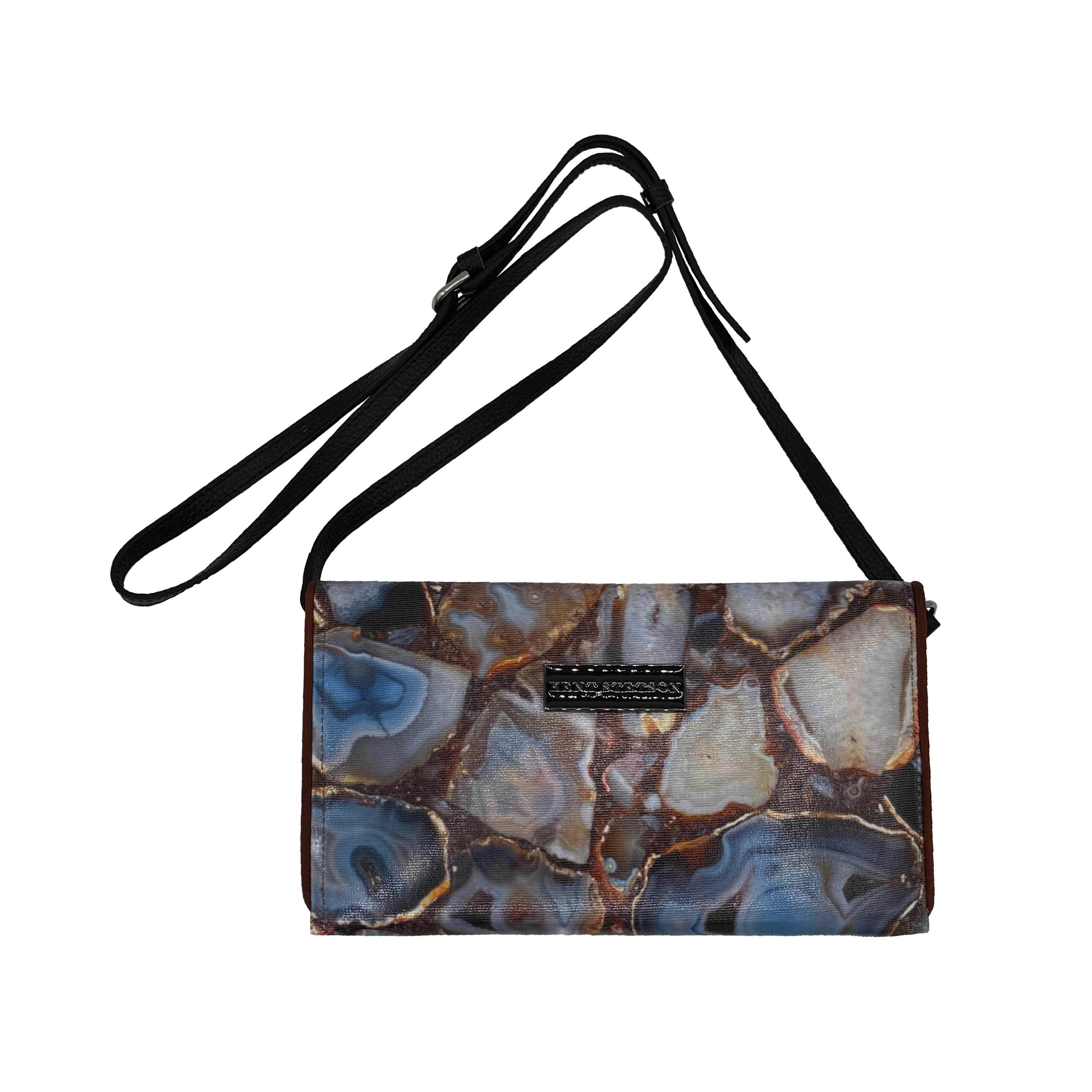 This luxurious clutch features a geode design. Accented in crystals and agate. Agate stone pieces may vary. Cruelty-free, made from luxury quality coated canvas. Includes a removable, luxe PU leather crossbody strap, a logo dust bag, a clear vinyl inner pocket, and is individually signed. The inside fabric may differ from what is pictured.