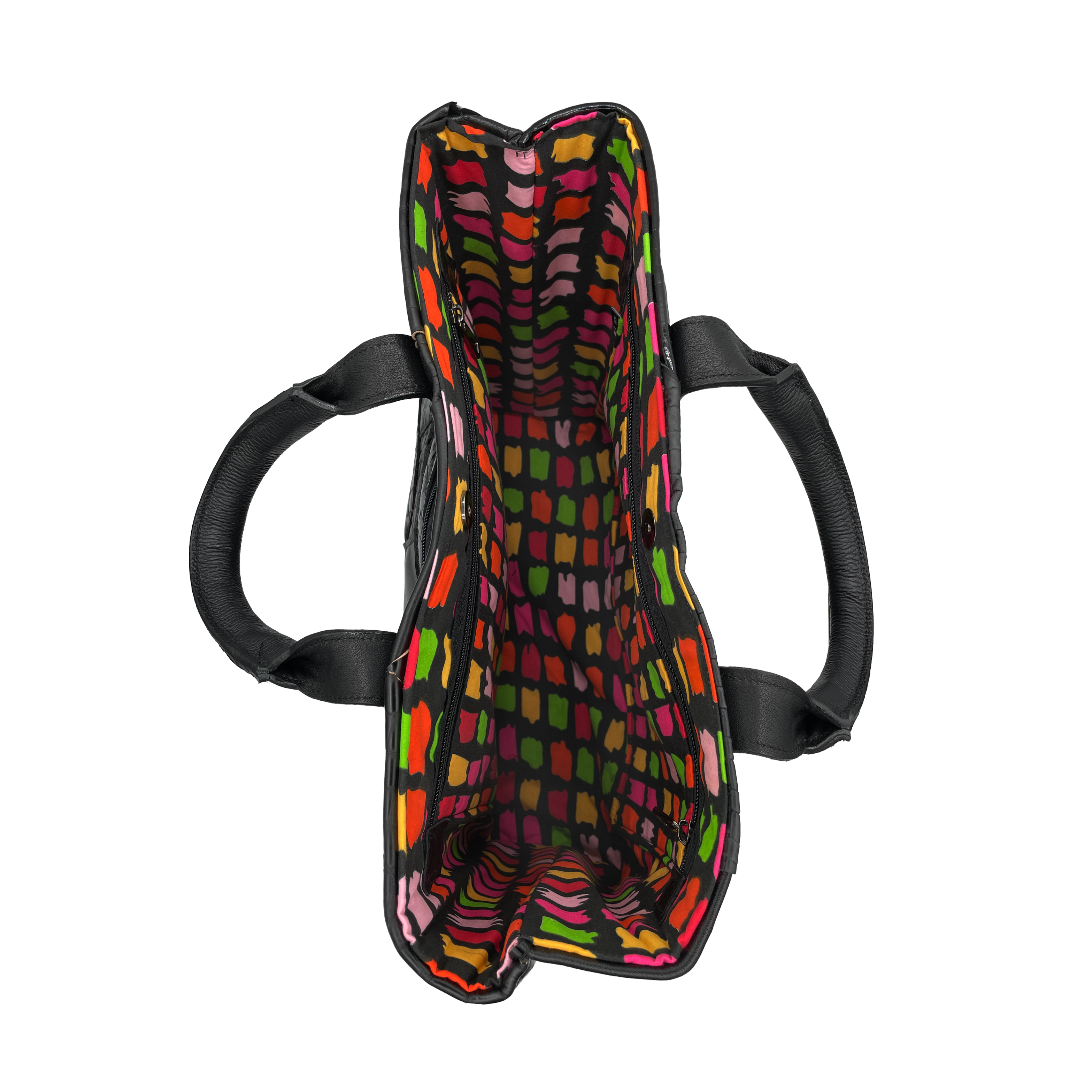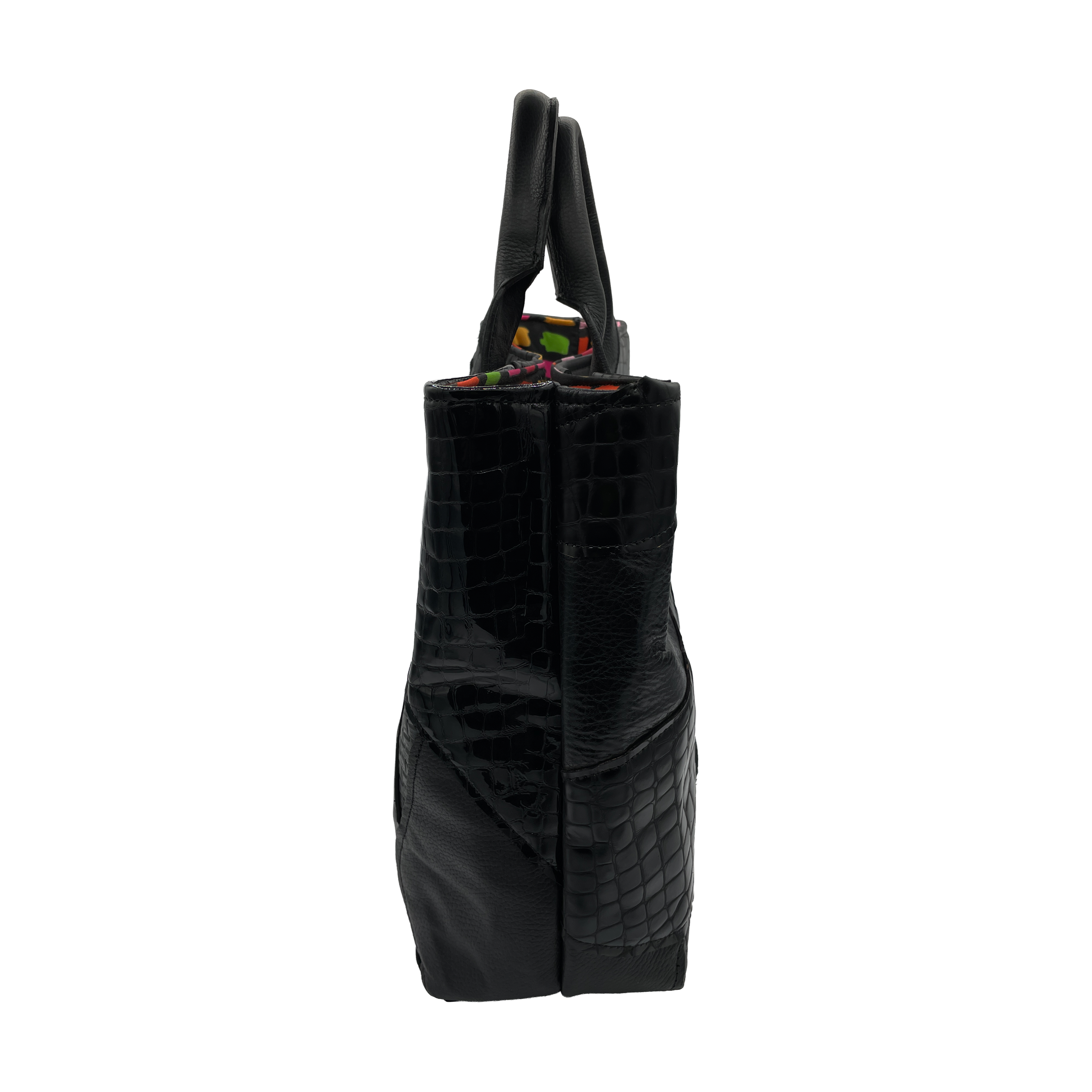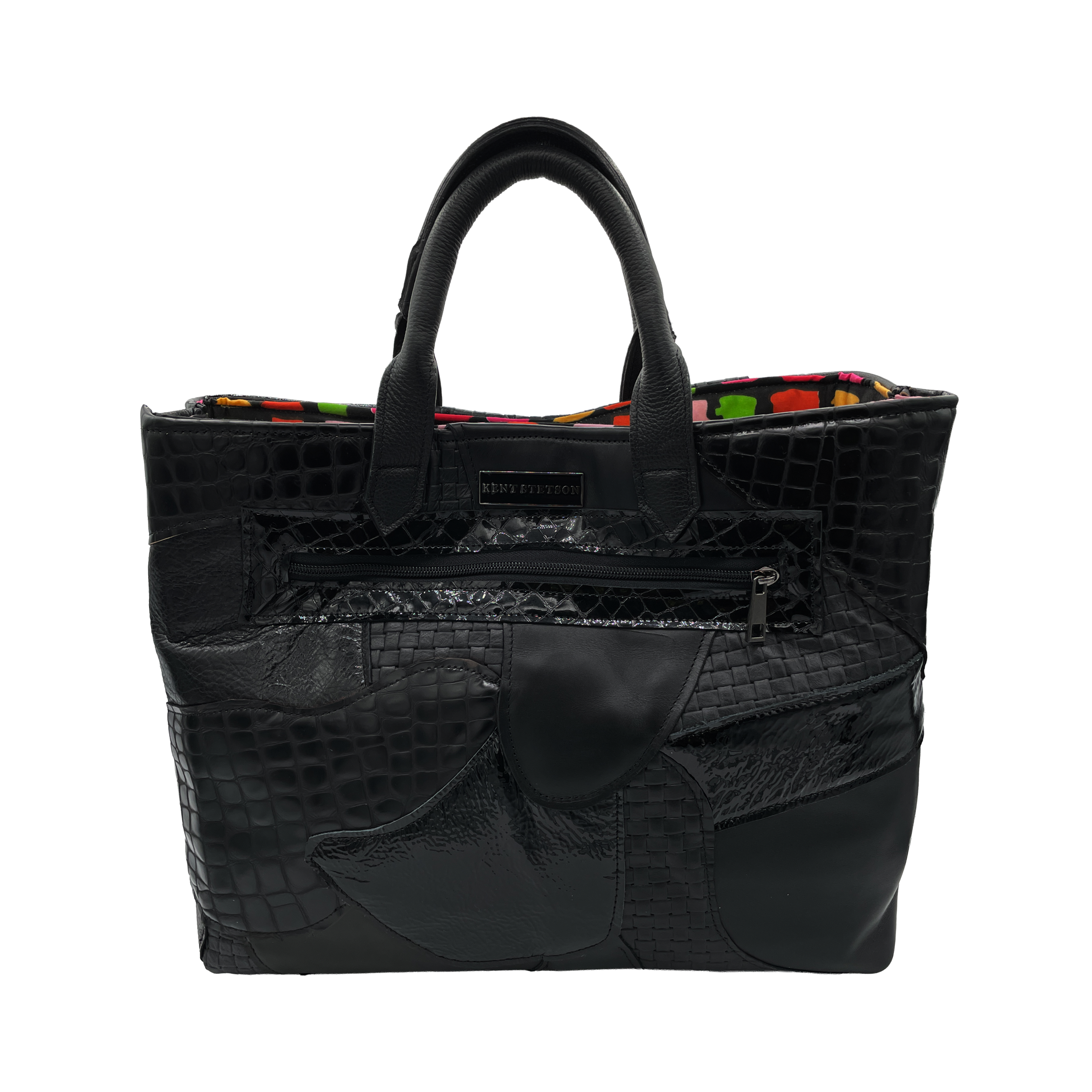 A unique patchwork of monochrome black textures and patterns makes this tote the chicest exclamation point on any outfit. Zipper closure, inner pocket, outside zip pocket.