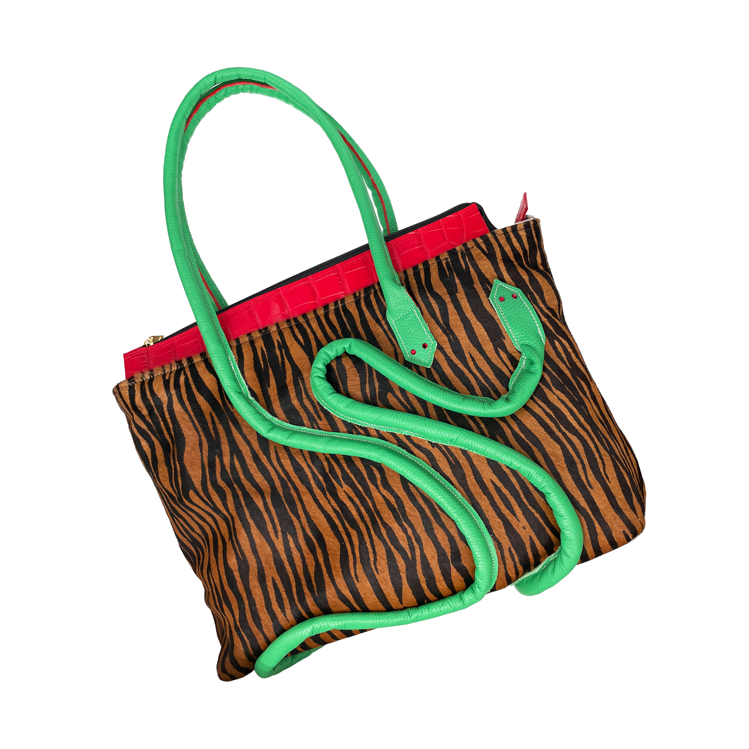 Saint or sinner, this playful snake inspired bag is a conversation starter for any occasion. Zipper closure, inner pocket, rhinestone details.