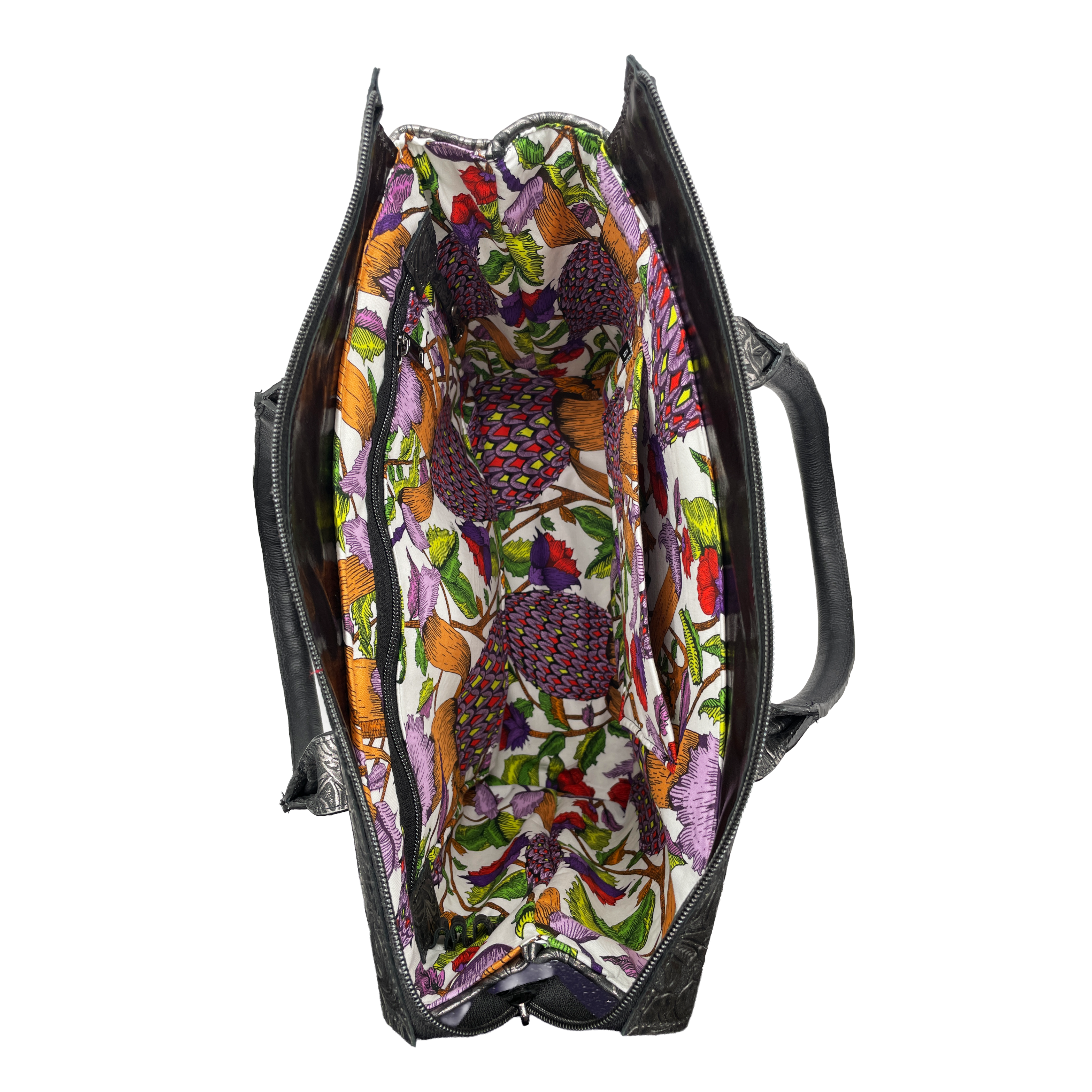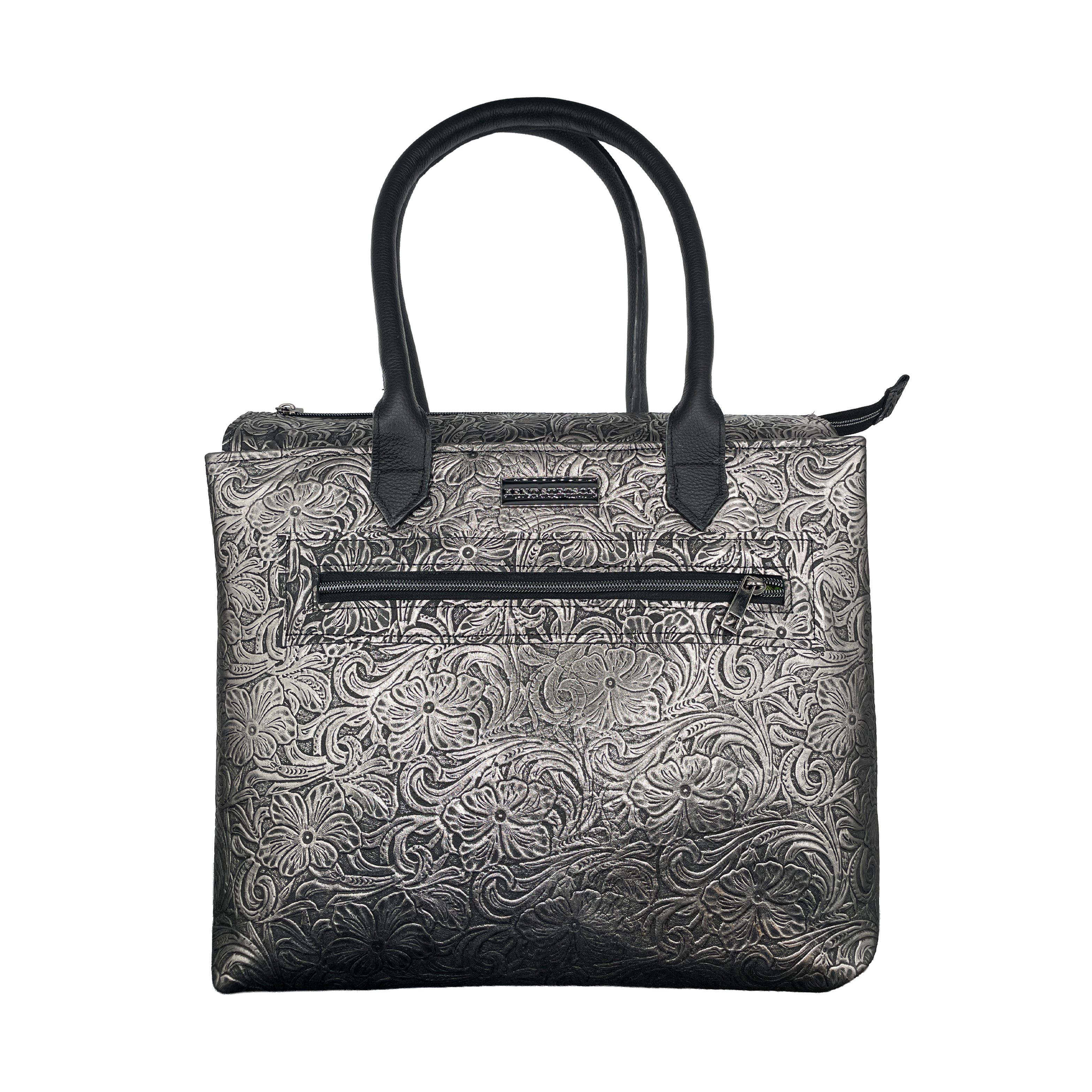This show stopping metallic pewter toned tote is sure to turn heads wherever you go. Zipper closure, inner pocket, outside zip pocket.