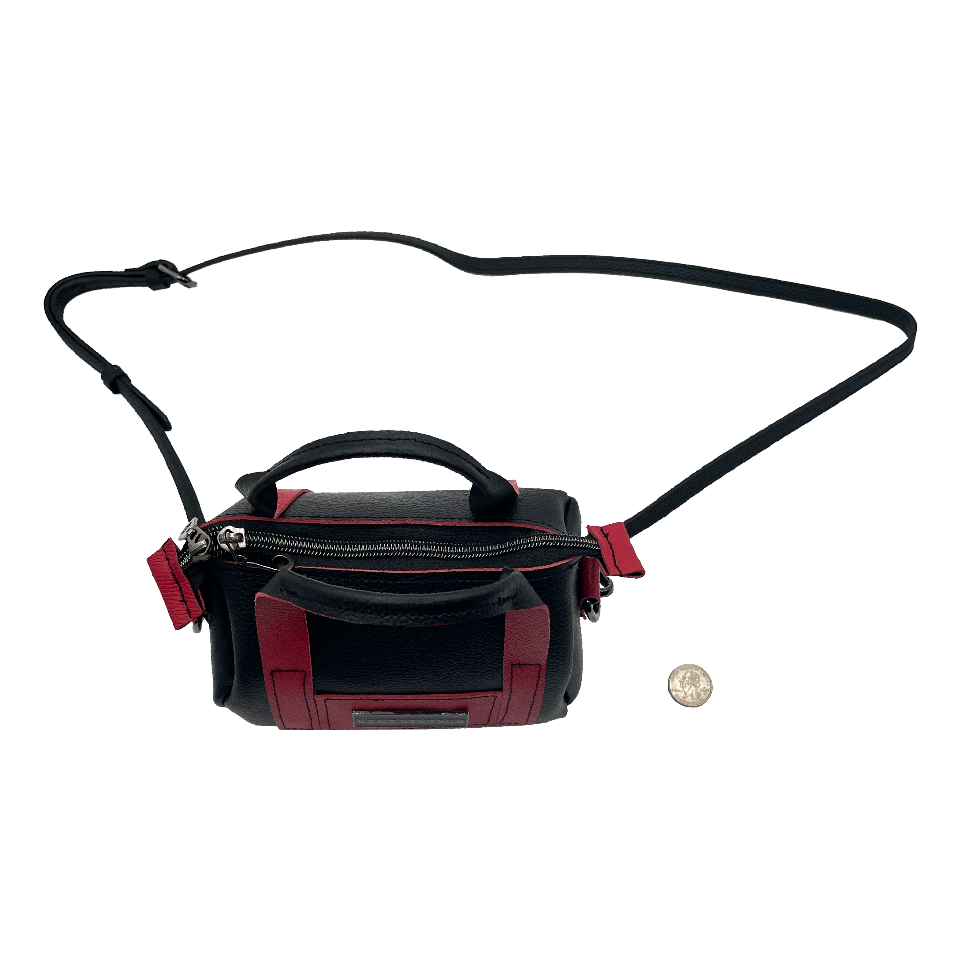A bold pairing of sleek black and striking red makes this micro duffle a small but mighty statement. Zipper closure, inner pocket, outside zip pocket. Removable shoulder and crossbody strap.