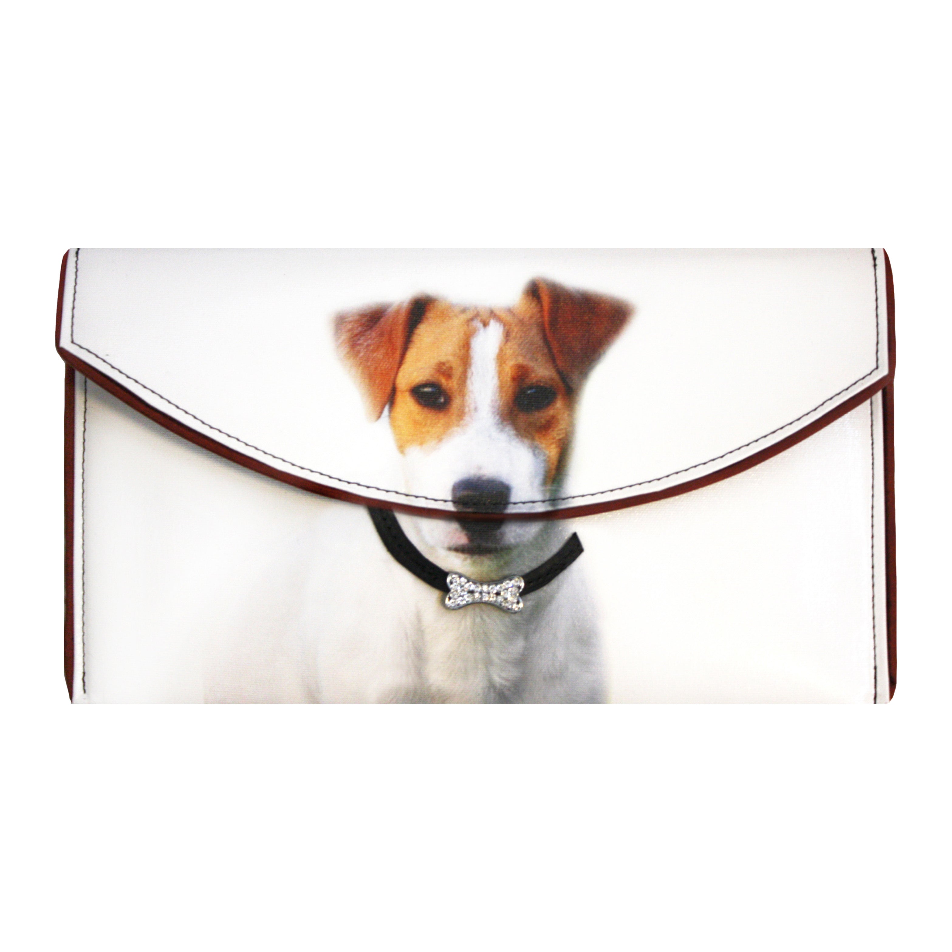 Play fetch with this Jack Russell Terrier clutch. Features crystal bone collar. Hand crafted to perfection. Cruelty-free, made from luxury quality coated canvas. All bags come with a removable cross-body chain, logo dust bag, clear vinyl inner pocket, and are individually signed. Inside fabric may differ from what is pictured. Price includes shipping.