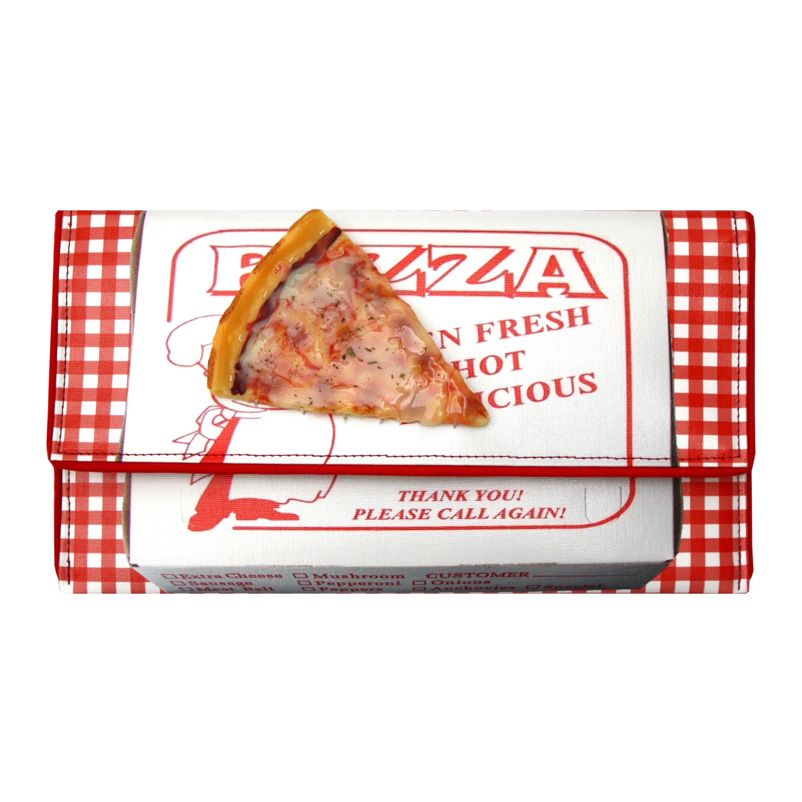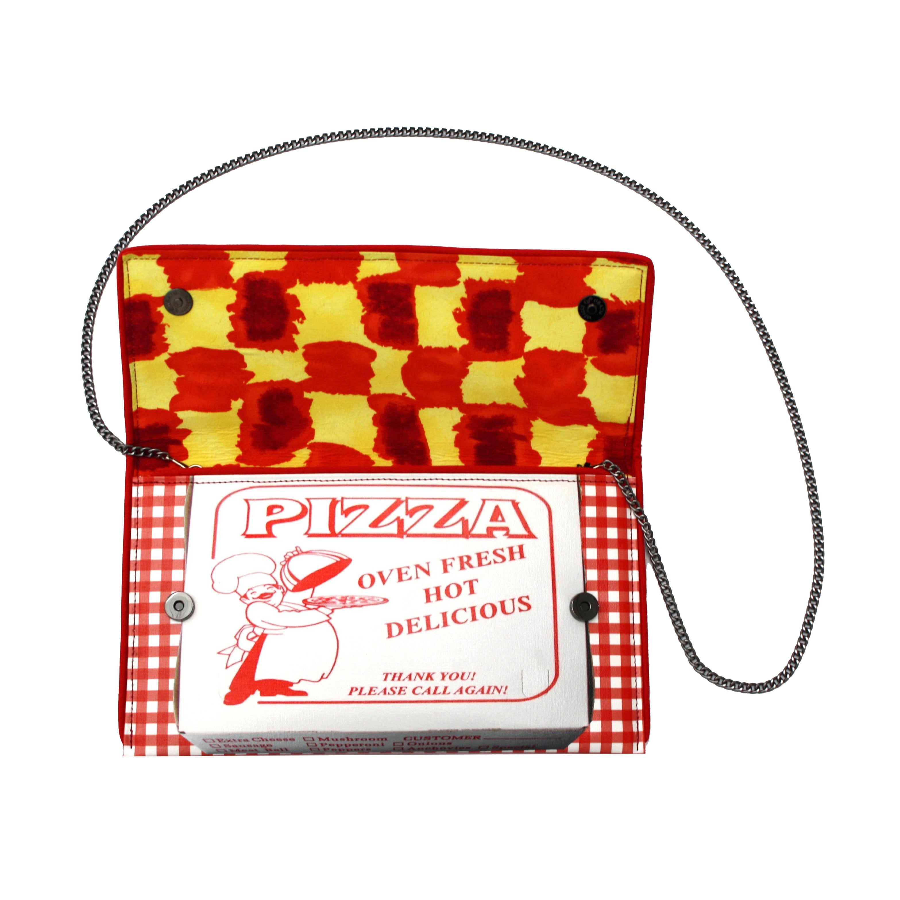 Who wants a slice? Hot and ready, this clutch features a 3D pizza slice. Cruelty-free, made from luxury quality coated canvas. All bags come with a removable cross-body chain, logo dust bag, clear vinyl inner pocket and are individually signed. Inside fabric may differ from what is pictured.